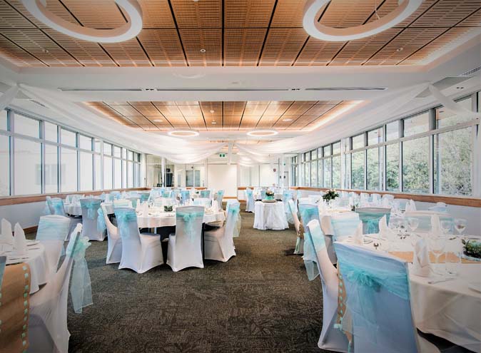 The Main Function Room is located on the first floor and has a wonderful feeling of openness, with windows running down two sides of the room, provides some views of the foothills. The room has state-of-the-art technology, a 160-inch LED screen. The room is licensed for 100 guests for weddings, engagements, cocktail functions, parties and corporate events and also can seat a 150-guest theatre style for seminars or conferences.