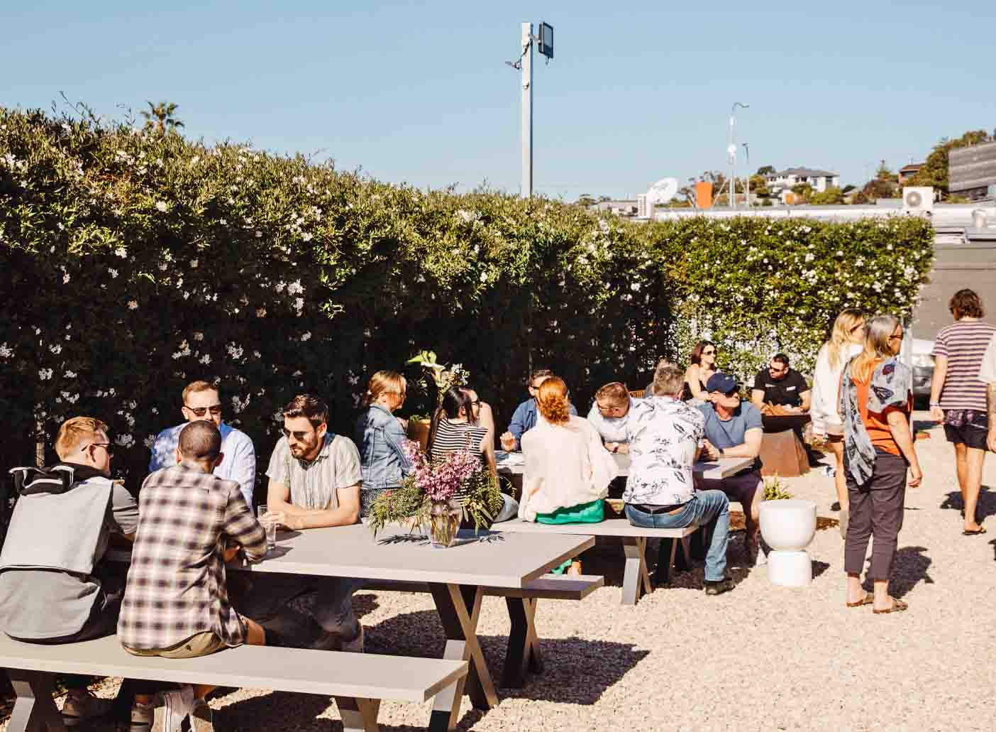 There are a variety of sitting and standing areas with fire pits and umbrellas for any type of weather.