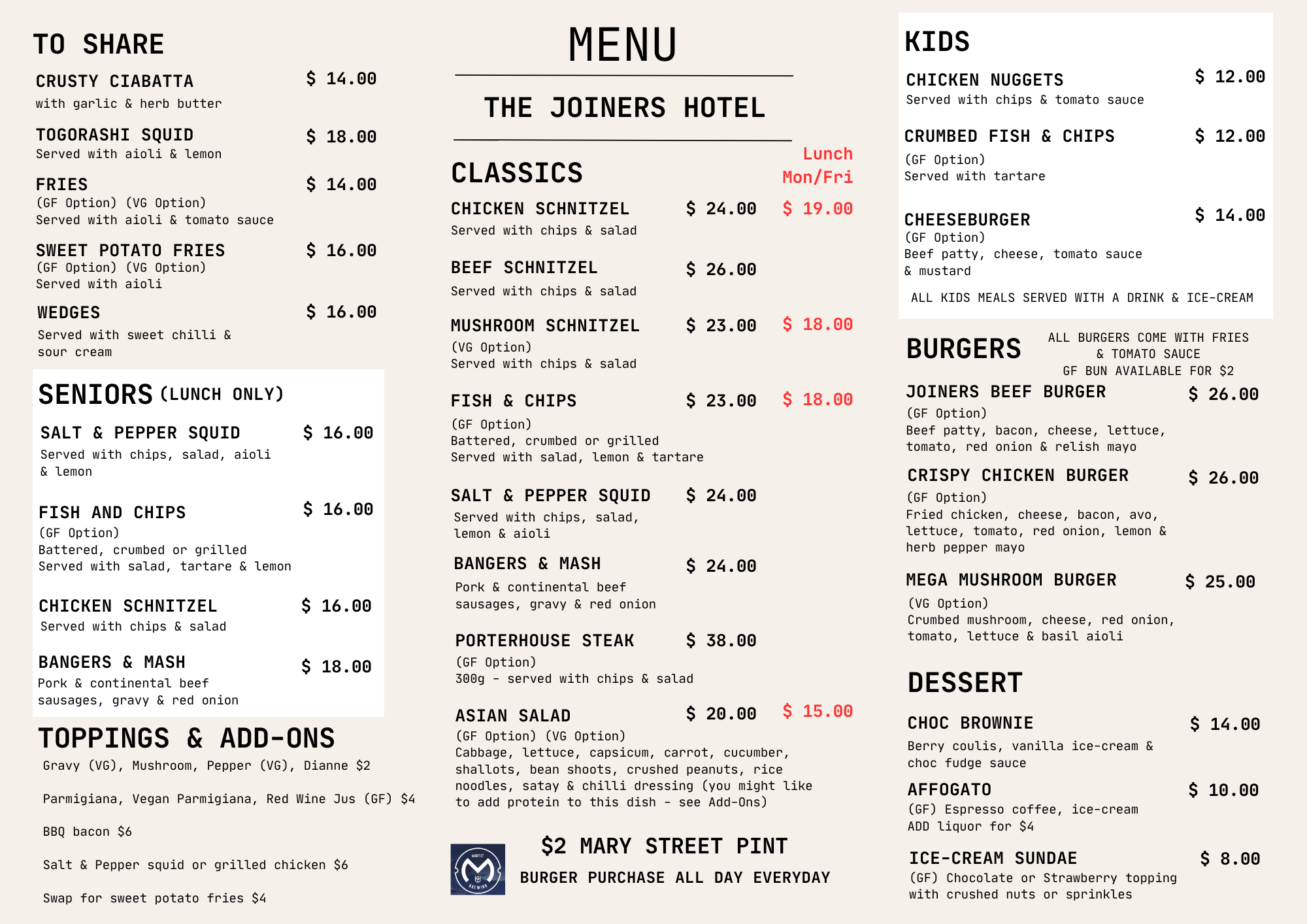 The Joiners staff are always up for a chat about their very own Mary Street Brewing beer that they have available on tap and for takeaway purchases.