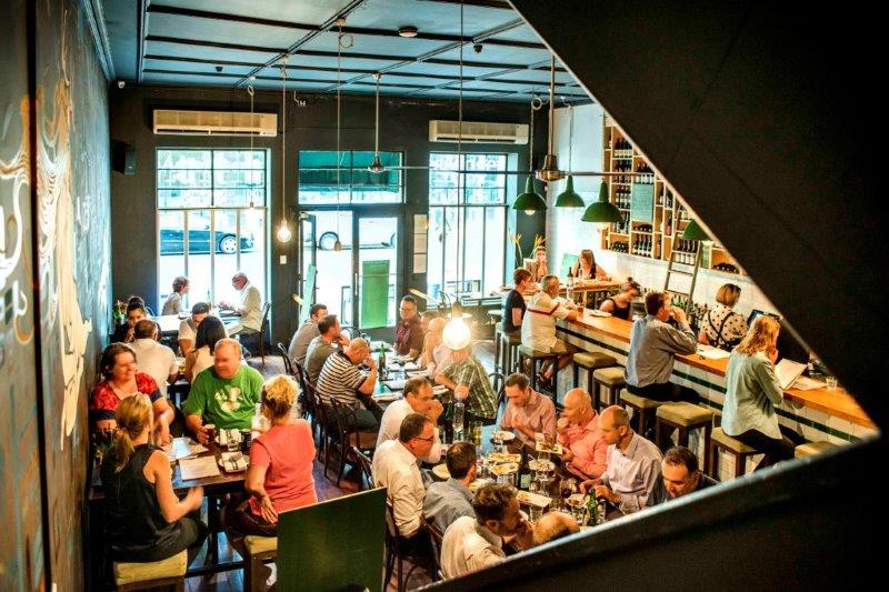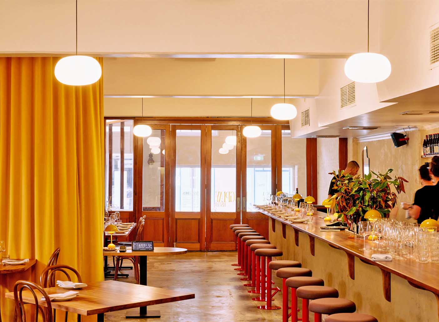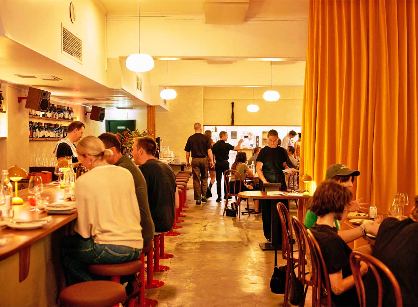 Longplay Bistro's main dining room, located in the centre of the bistro with their open kitchen on one end, their iconic yellow curtain on the other and a set of West facing windows.
