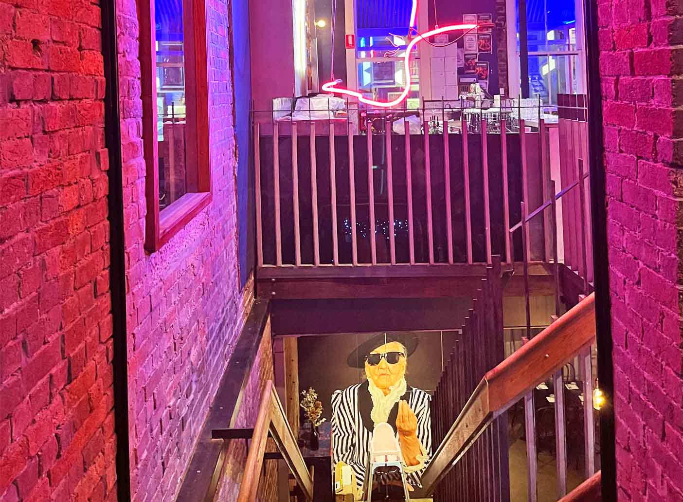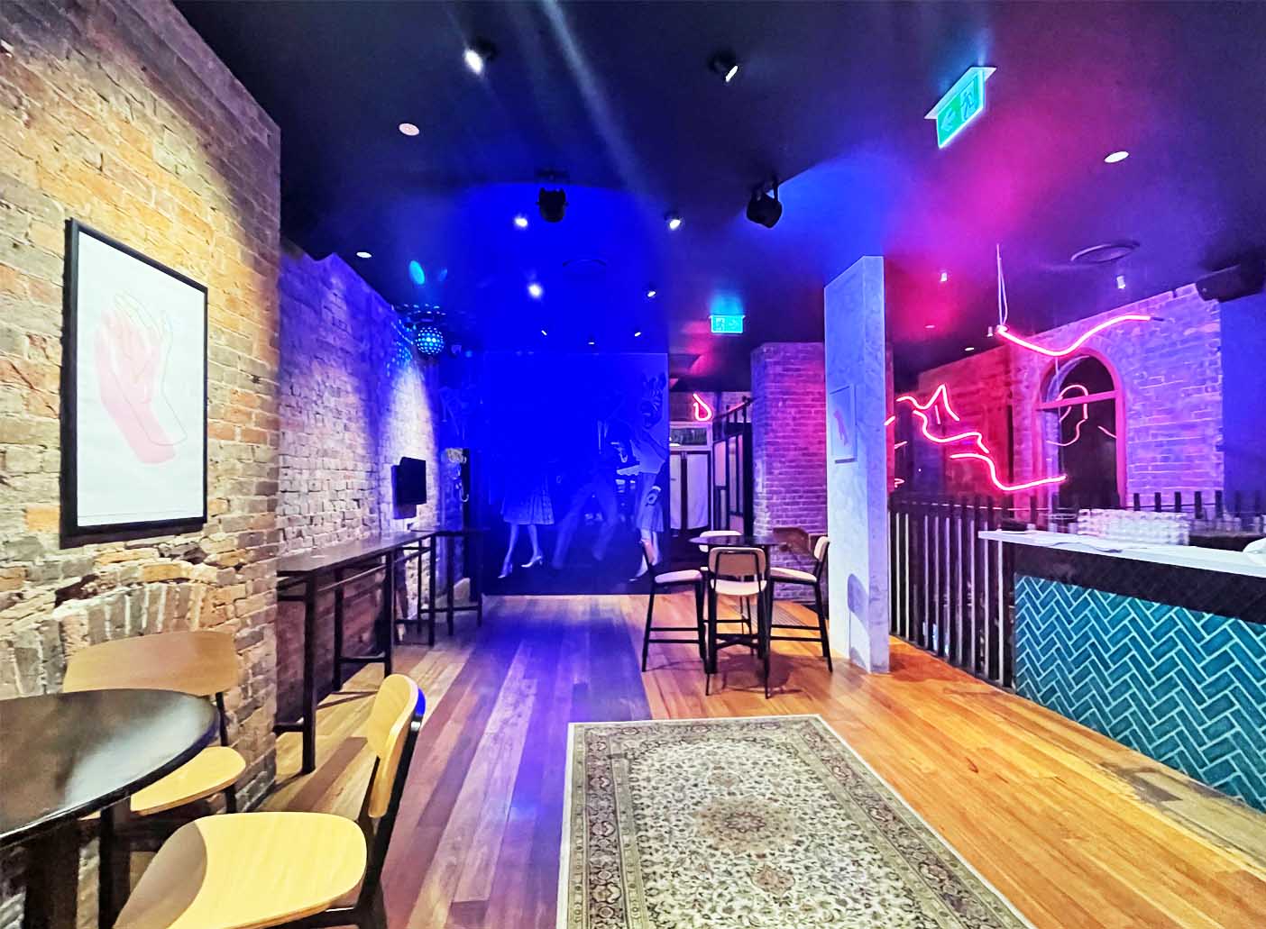 Step inside and find a seat on level one, perfect for grabbing a bite, catching up and sipping a drink under the neon light.