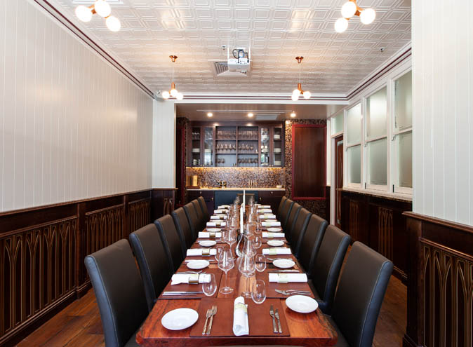 Located behind the kitchen, the private entry to the dining room is off Machinery Street, with the space seating a maximum of 18 guests. Perfect for both corporate and personal events; AV features include wi-fi, ceiling mounted projector with Foxtel connection, motorised screen and sound system.