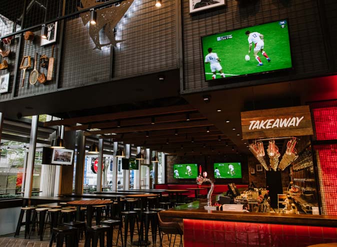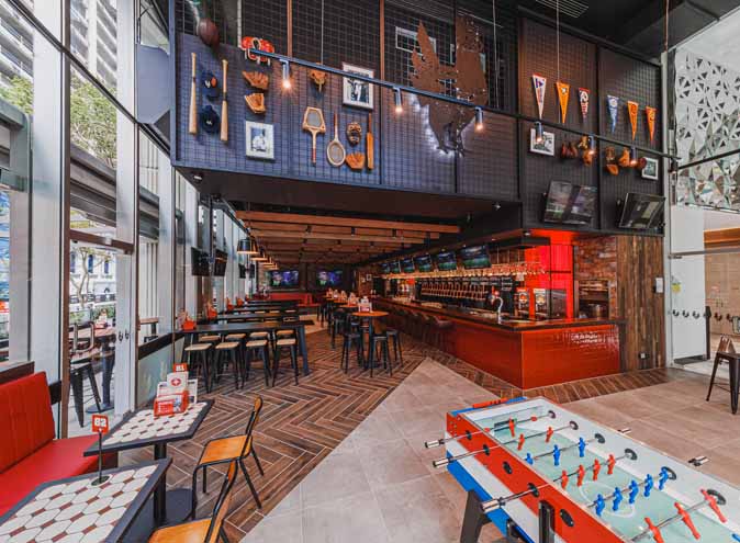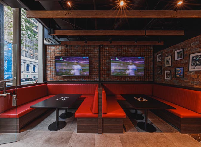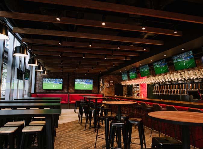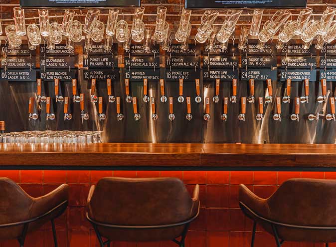 The venue features a long bar that runs the length of the diner, it can seat up to 14 on high stool chairs. Winghaus' sister venue, The Bavarian’s signature stein chandelier hangs over the bar, which holds over 200, 1-litre, authentic glass steins, and a custom-built, 40-beer tap wall.