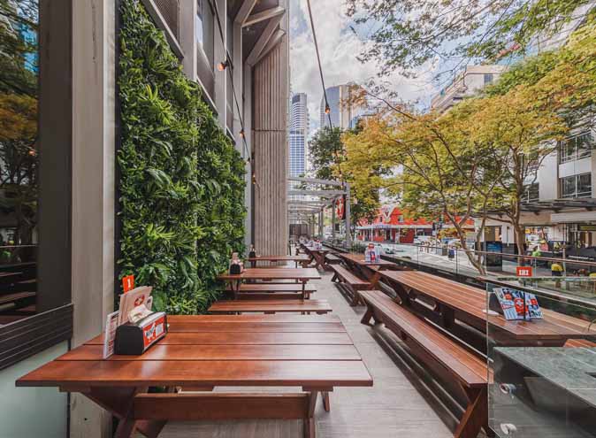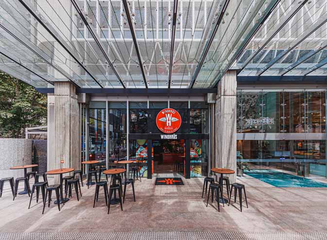 WingHAÜS  is like stepping into an American diner, with high table tops, communal tables, bar stools and leather booths and a large, open-plan space. Nostalgic signage, neons and hints of Bavarian heritage adorn the walls.