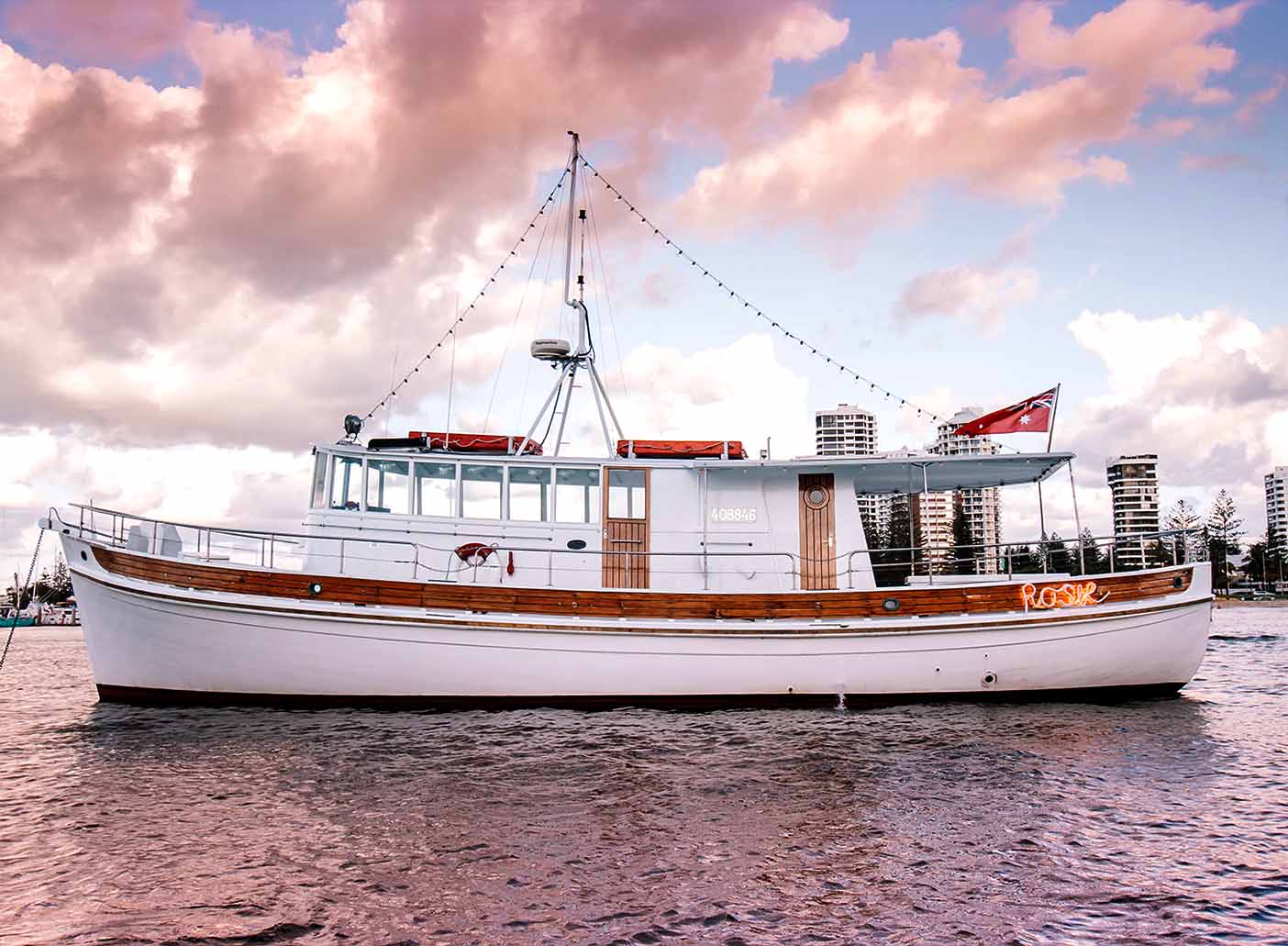 Step aboard Rosie, a beautifully restored 1960s timber cruiser that brings vintage charm to the Gold Coast Broadwater. With her mix of indoor and outdoor spaces, comfy seating, and laid-back coastal s...