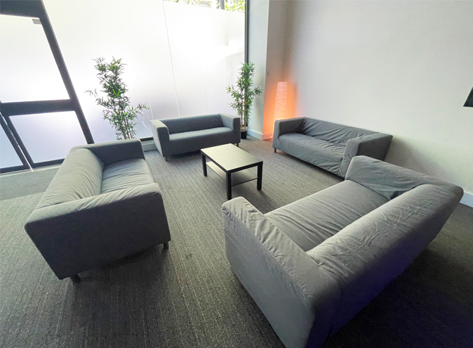 In between escape rooms, the seating area is available for participants to take a break, kick back, relax, and play games.