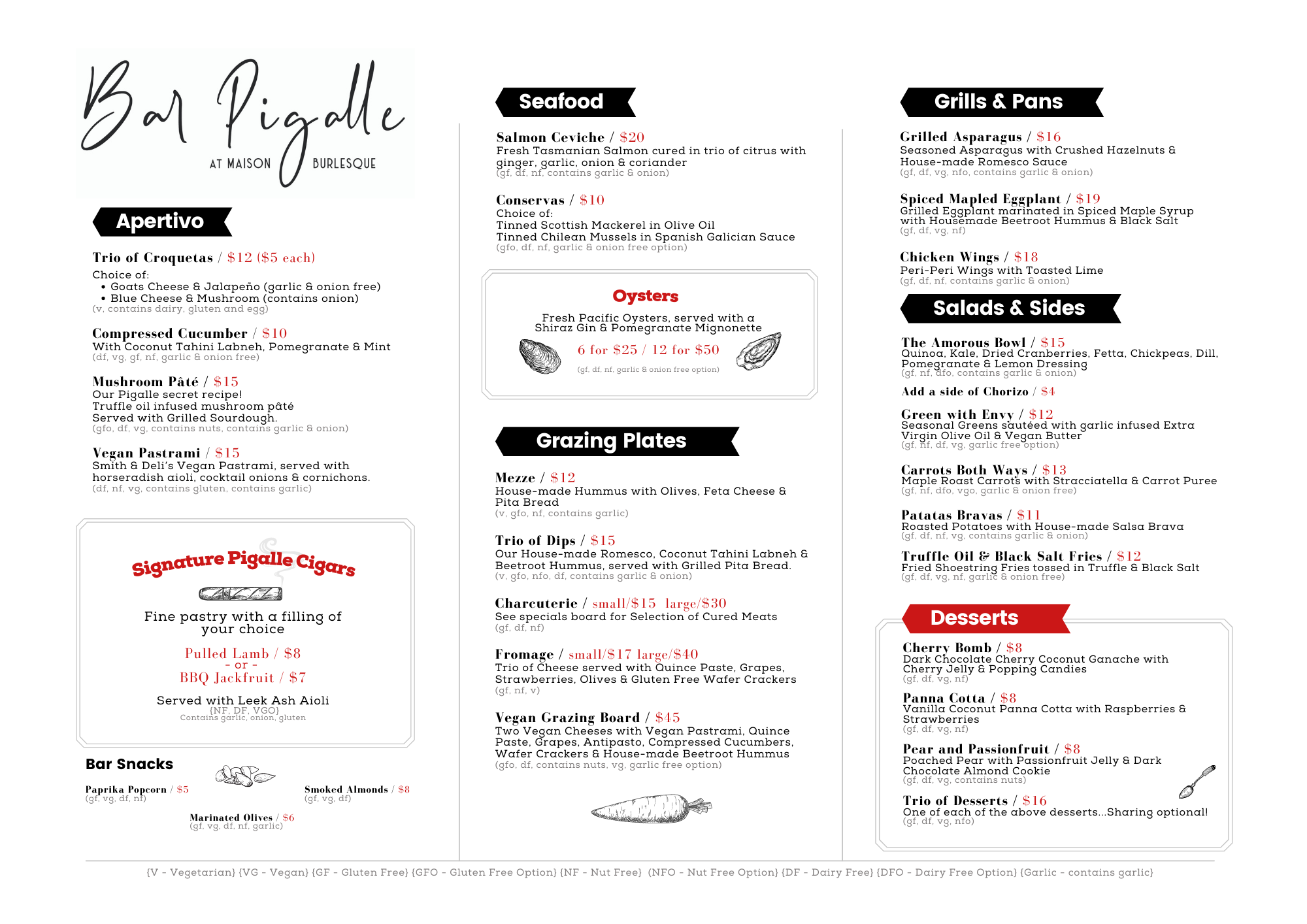 Bar Pigalle is not just a bar & entertainment space, it also boasts a delicious menu of tapas-inspired dishes, designed to share. Enjoy the view from your table while you dine in style. We also pride ourselves in catering for a range of dietary needs - with the majority of menu options suitable for vegan, gluten free and more! But save some room for dessert - our Dessert Trio platter has left audiences raving for good reason...
