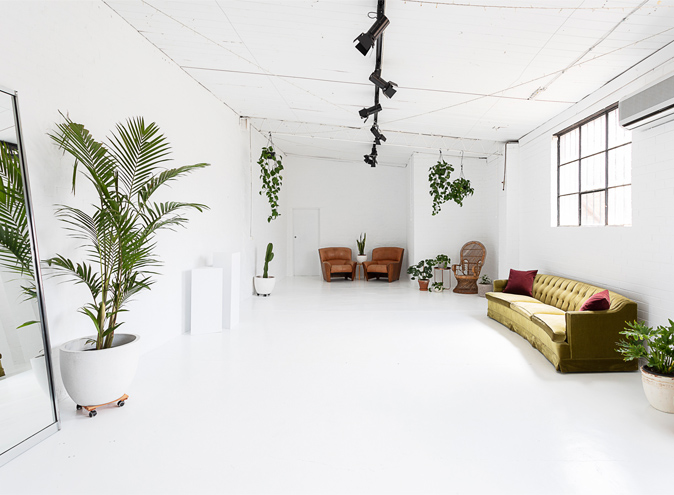 A blank canvas, The studio is a large open plan space that allows for a wide range of personalisation depending on your style. If you need additional space, they have a separate room that adjoins the open plan studio that can be hired as well. Think of this room as the chill zone—a mid-century style lounge room open fireplace.