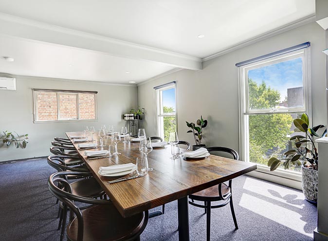 Located on the second floor overlooking Faraday Street this classic space features high ceilings with art deco fixtures as well as an entrance room for arrival beverages and canapés. The Faraday Room accommodates up to 18 guests on one long table for a seated event. With an abundance of natural light the Faraday Room is the perfect space for an elegant lunch or an evening spent drinking great wine as the sun sets over Carlton.