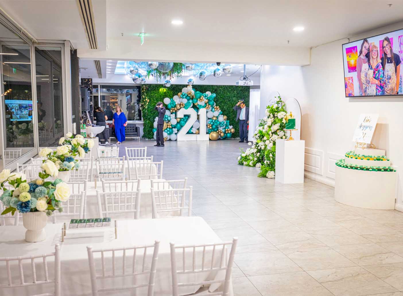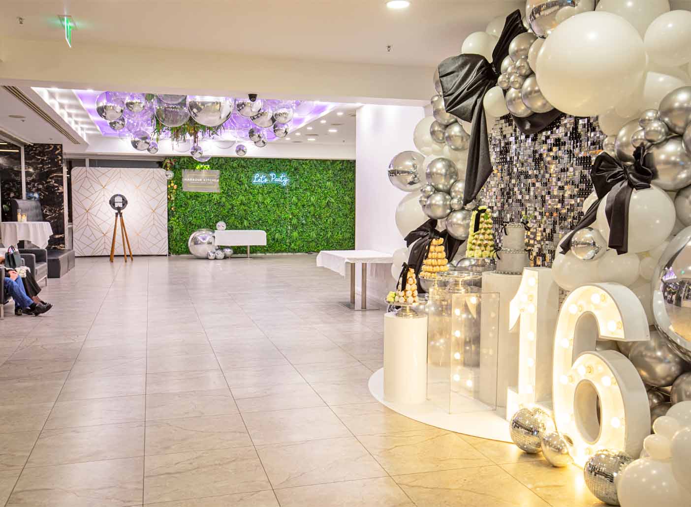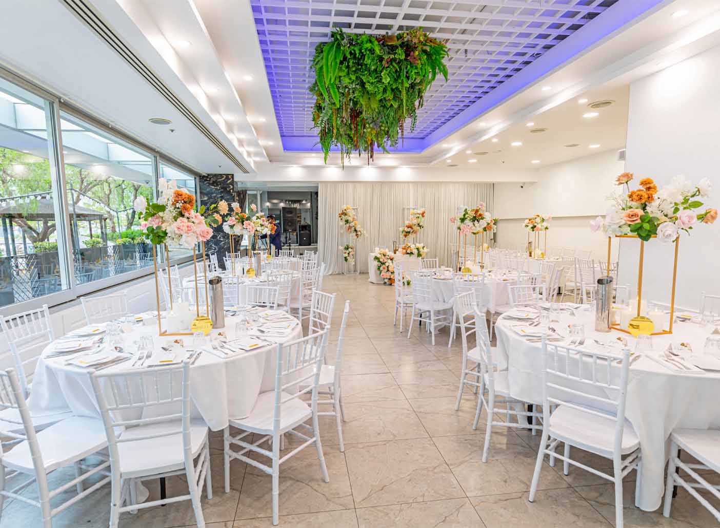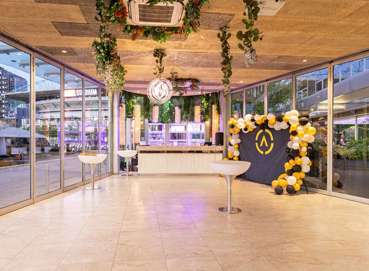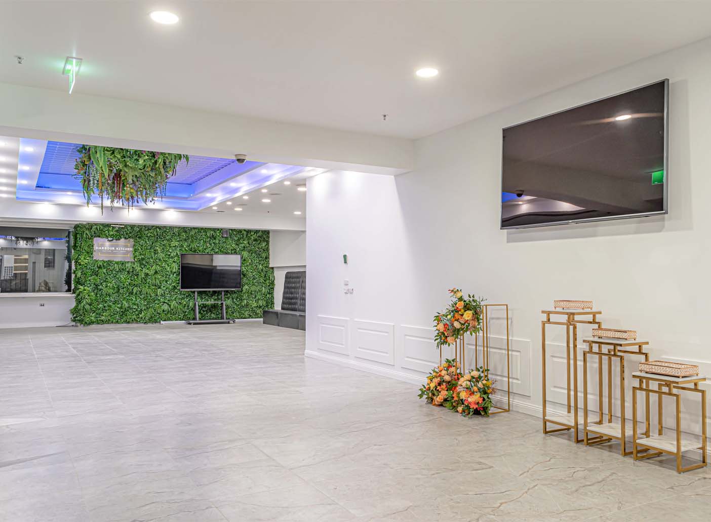 Boasting lush green-wall installations and warm pea lighting, this adaptable space can be decorated to match your vision, helping each event feel personal and unique. To top it off, the chic black and gold marble bar offers a touch of luxury, guaranteed to impress your guests.