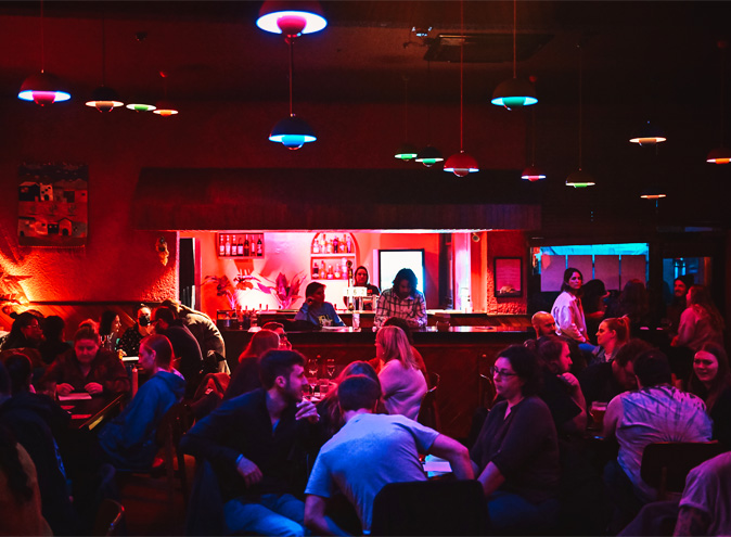 The glasshouse, a sizable indoor garden setting is commonly used for events of many kinds, from drag brunch and movie nights to birthday parties and weddings. This space is located in the back of the venue.