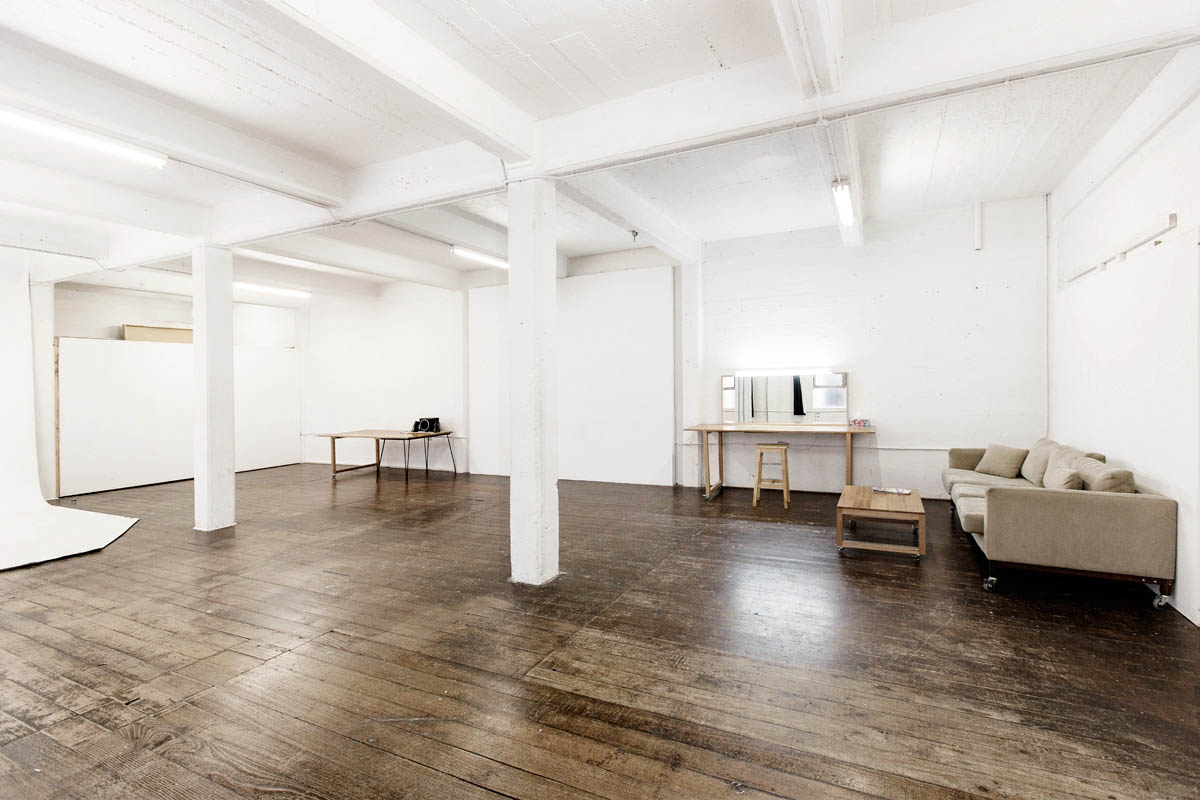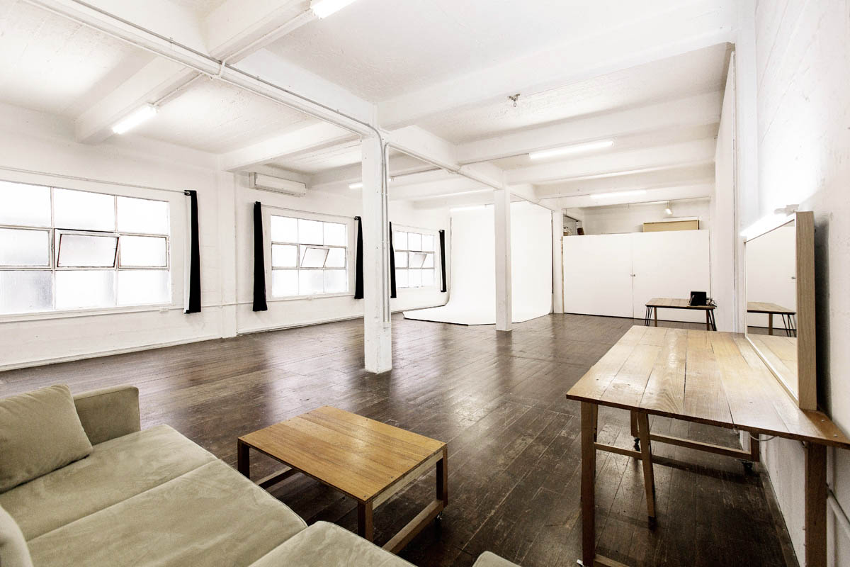 120sqm event space, featuring white walls, rustic floorboards and retractable cyc.