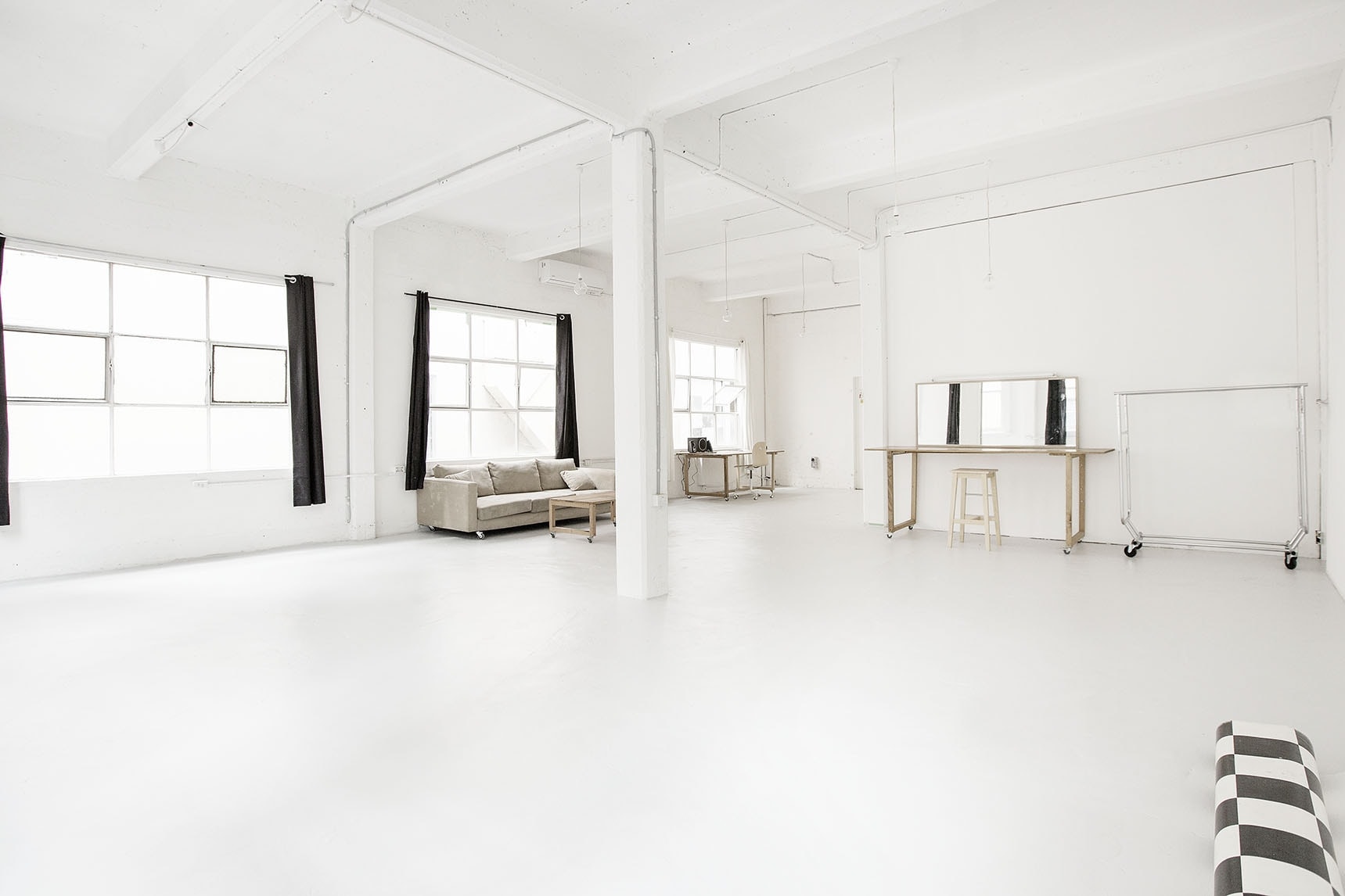 An 84sqm function space, featuring light grey cement floors, white walls and retractable cyc.