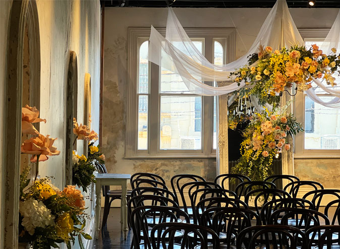 Embracing a layered approach to materials, the venue reflects the beauty and fragility of the historic site. Burnished concrete floors, exposed-truss ceilings, raked render and troweled brick walls create a textural backdrop, drawing focus to the striking articulation of floristry and café benches. Custom carved from solid blush-toned marble, the bench’s scalloped profile is a creative hallmark of the space, complemented by linen drapery and tiered flower displays that define a series of dining settings in timber and cognac leather.