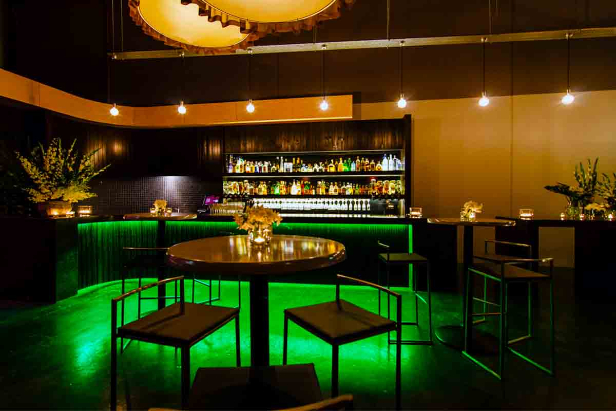 The discovery alone is as impressive as the venue's distinctive emerald concrete floor and elongated stone bar which is warmed by the enormous floating pendant lights streaming from the exposed industrial ceiling above.