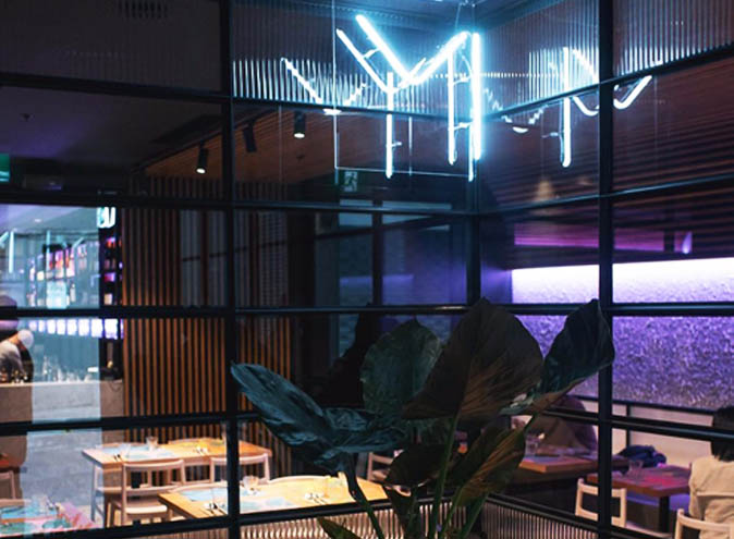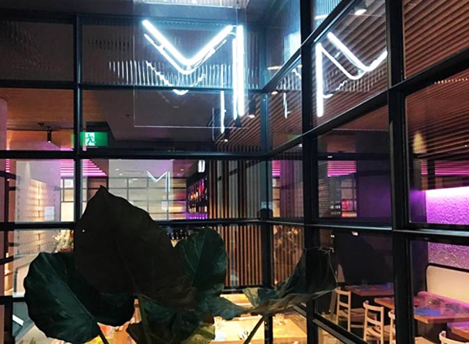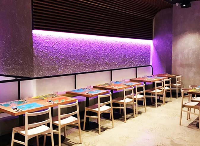 Purple neon lighting surrounds this space – giving it a unique and contemporary look compared to typical Indonesian spaces. The tables are decorated with colourful placemats, creating nice accents to the otherwise minimal aesthetic.