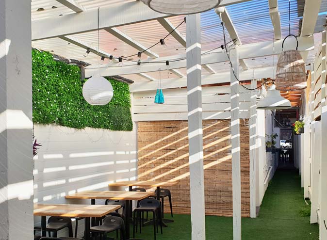 The covered courtyard provides a great setting for a long lazy lunch or dinner.  A single long table can seat 20-30 people, or a standing gathering can accommodate 40 people comfortably in a casual Elwood atmosphere.