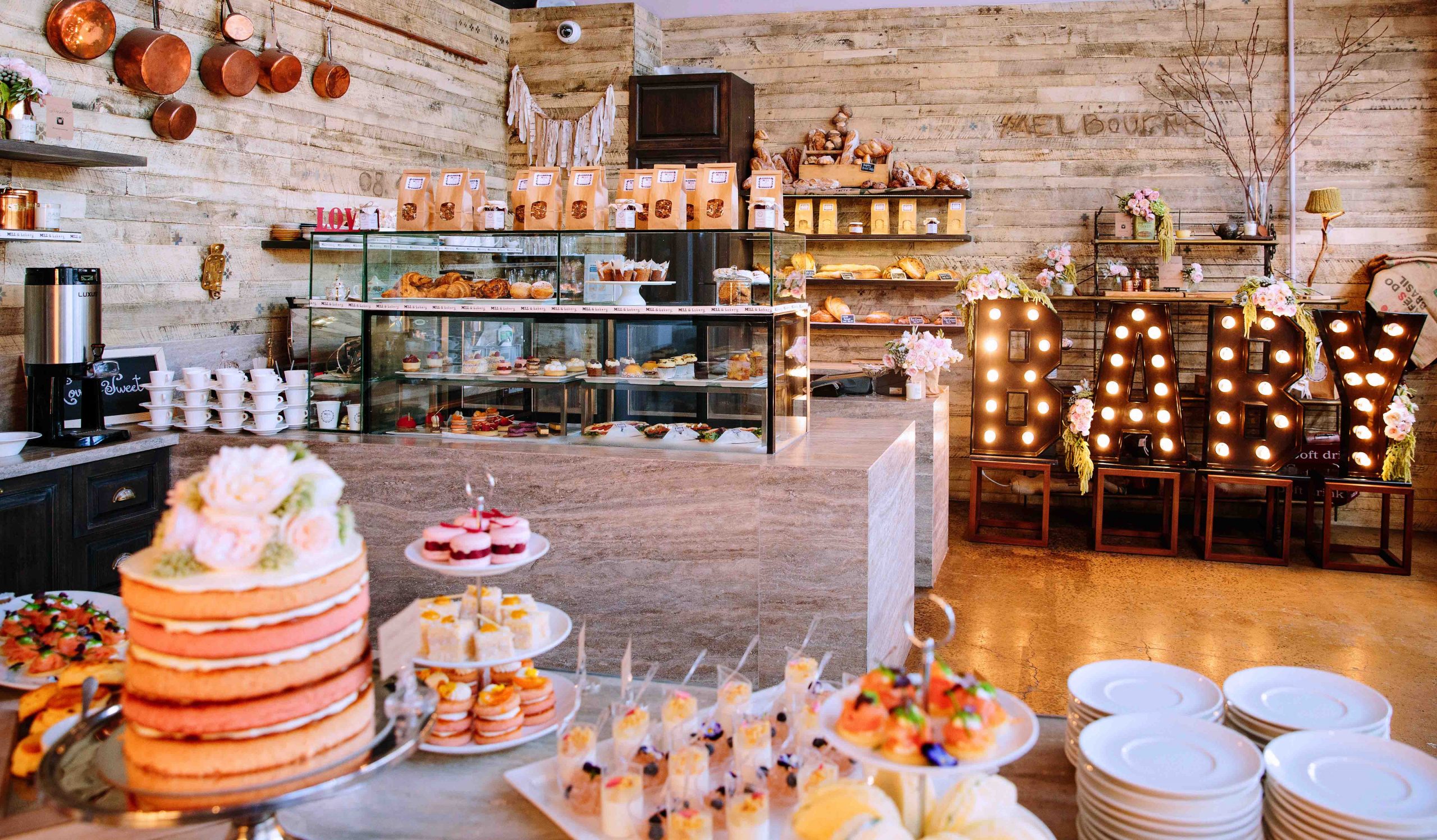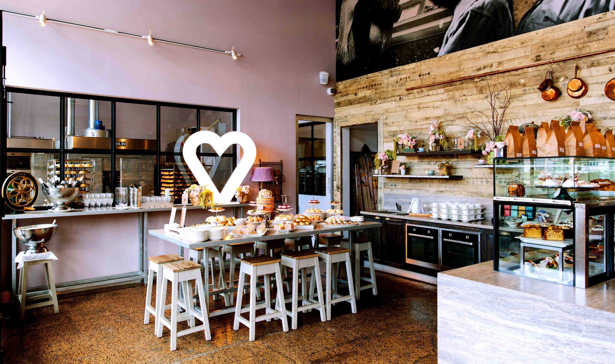 Coupled with a colourful display of assorted pastries, yummy sweets and savoury options available, superb coffee and a friendly welcome, Mill & Bakery is a distinct and beautiful space for an engagement party, product launch, kitchen tea, baby shower or even an intimate wedding.