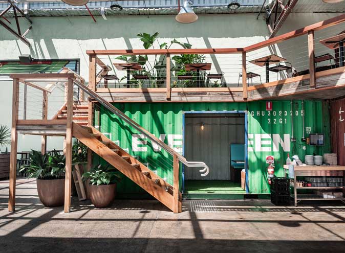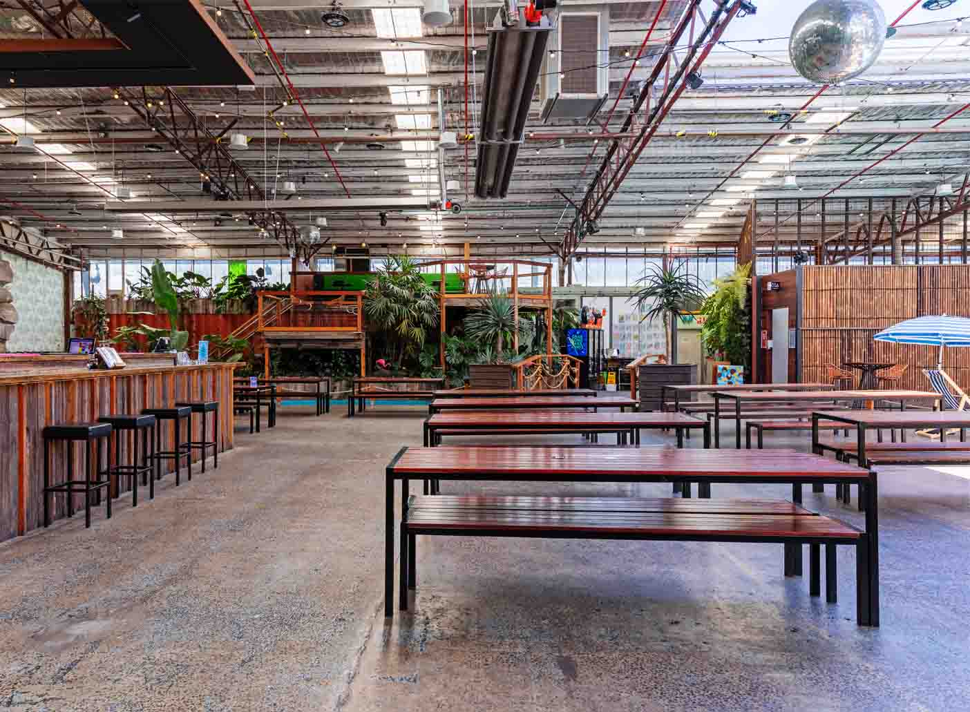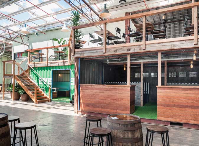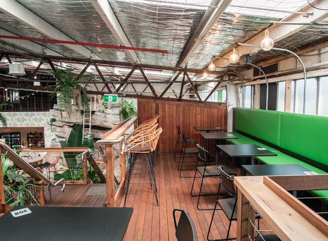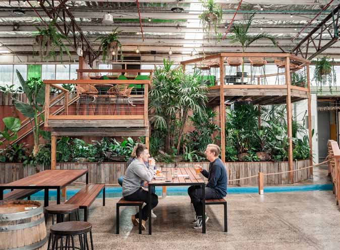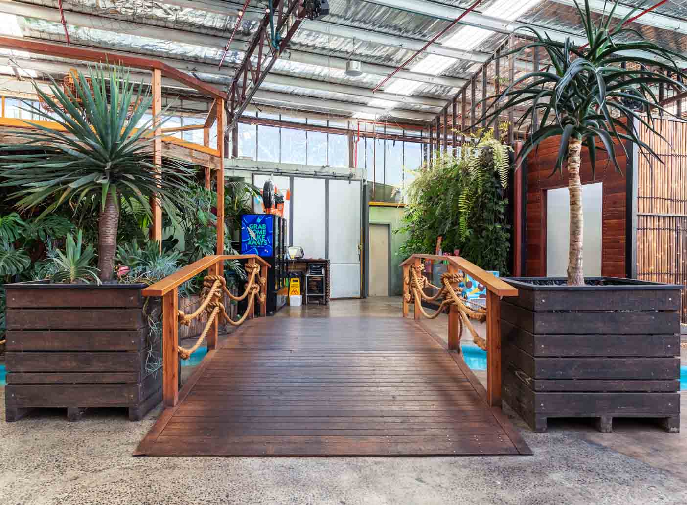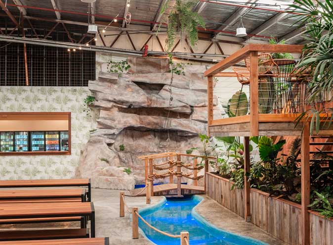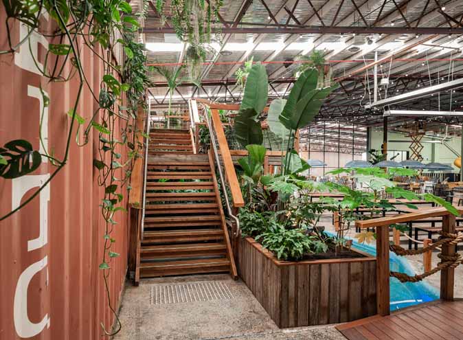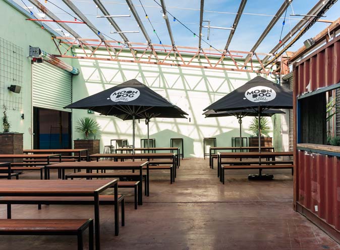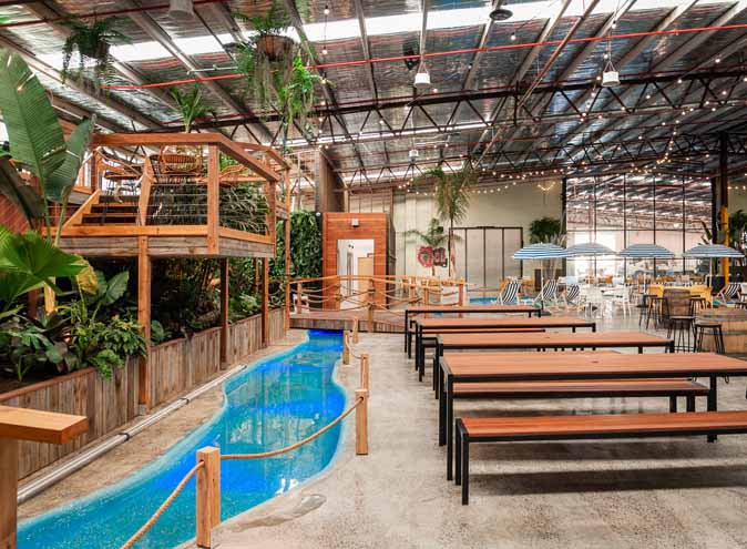 Moon Dog World is a jungle themed warehouse bar tucked away in the side streets of Preston, just north of the CBD. The 700 capacity venue offers food and drinks and many places to sit amongst the shipping containers, greenery, deck chairs and lagoon.