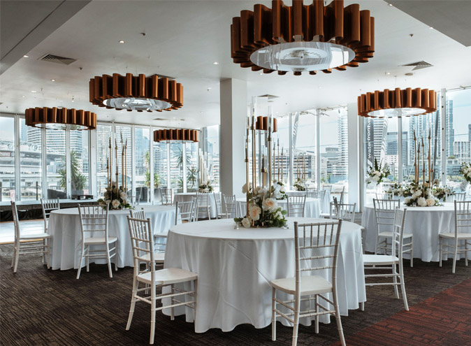 The space is gorgeous, boasting glass bi-fold doors that offer panoramic views of the skyline and harbour. These can also be opened to include the big undercover balcony to turn your event into a beautiful al fresco experience.
