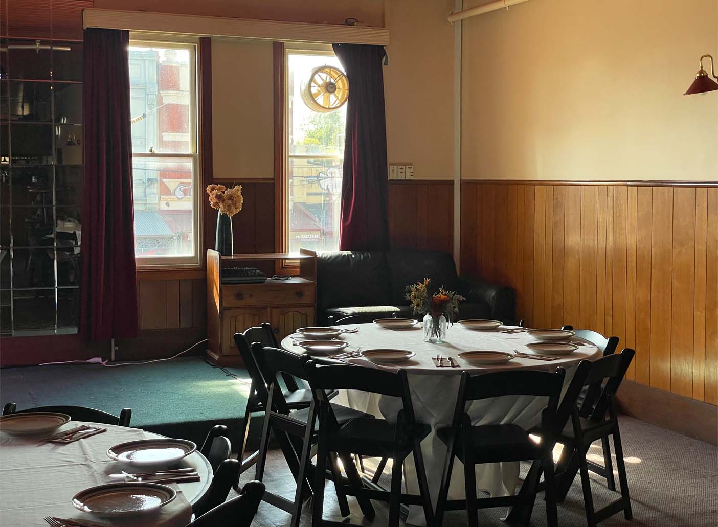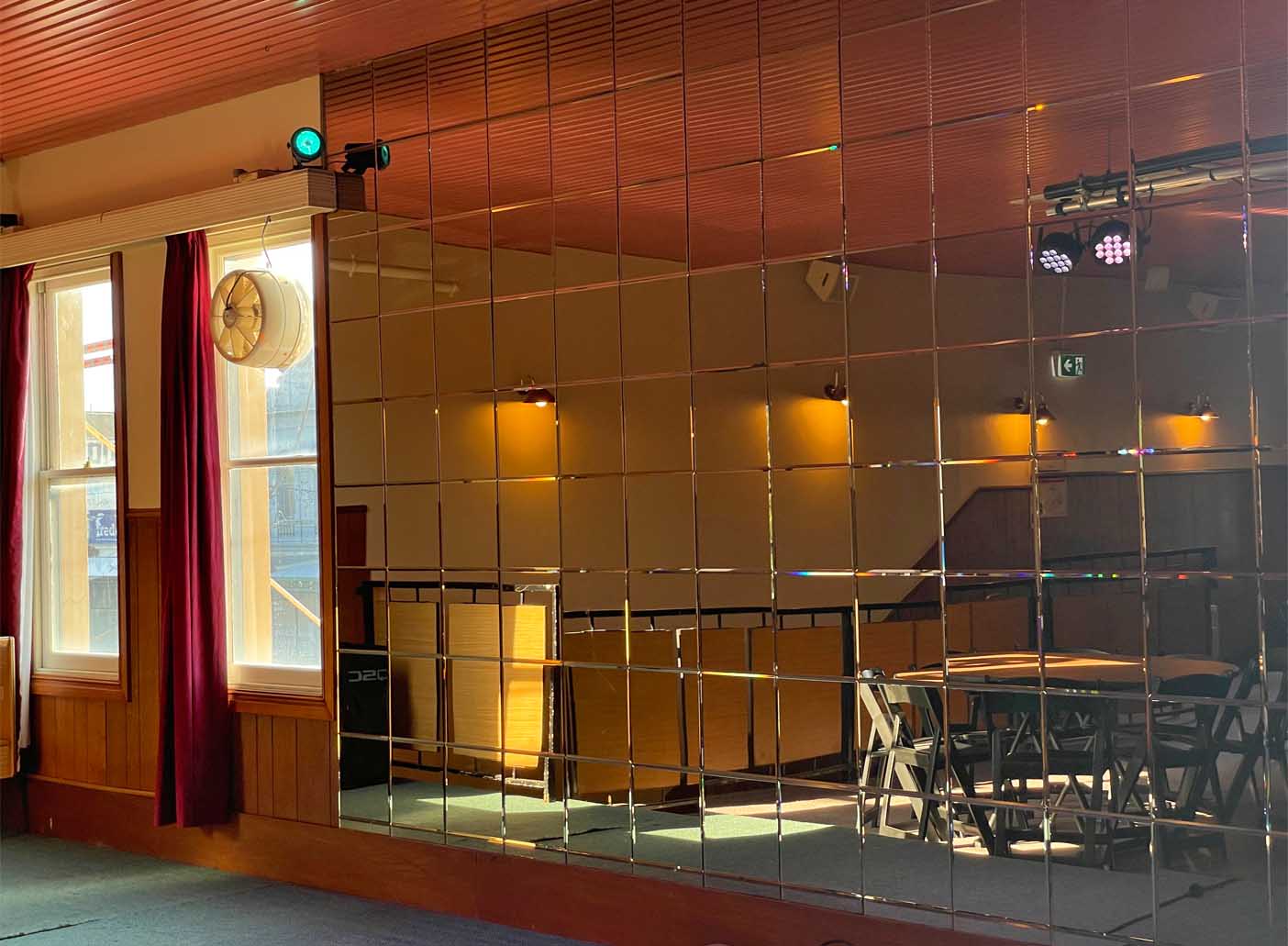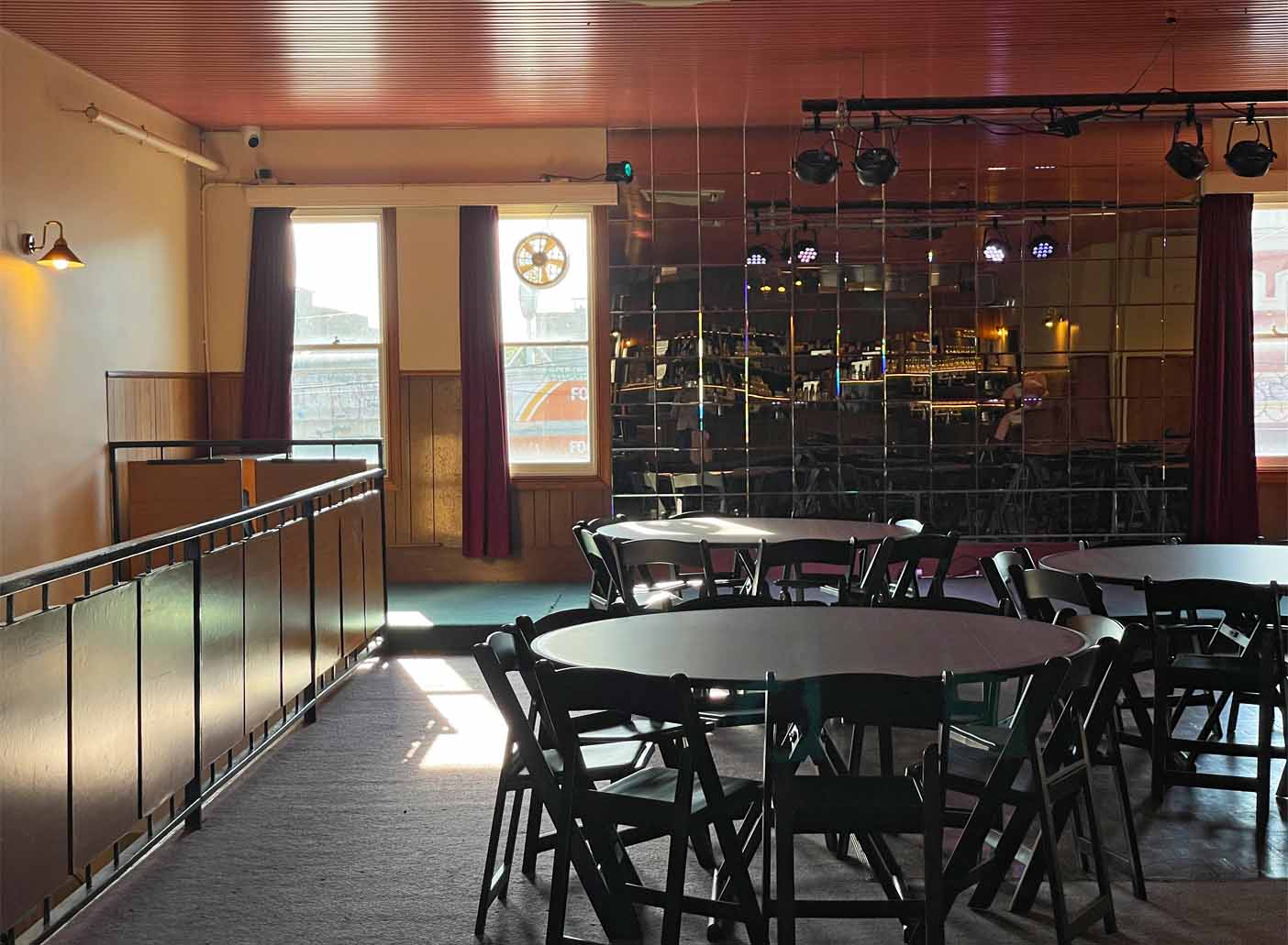 Step into the Railway’s upstairs Ballroom, where timeless charm and classic decor come together to create a truly unique setting for your private event. This space is full of character, featuring a striking vintage mirror-paneled wall, a sparkling disco ball, and all the nostalgic touches that transport you back to a golden era.