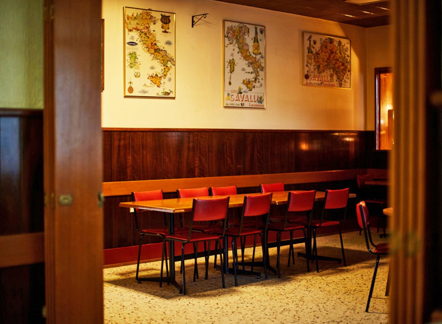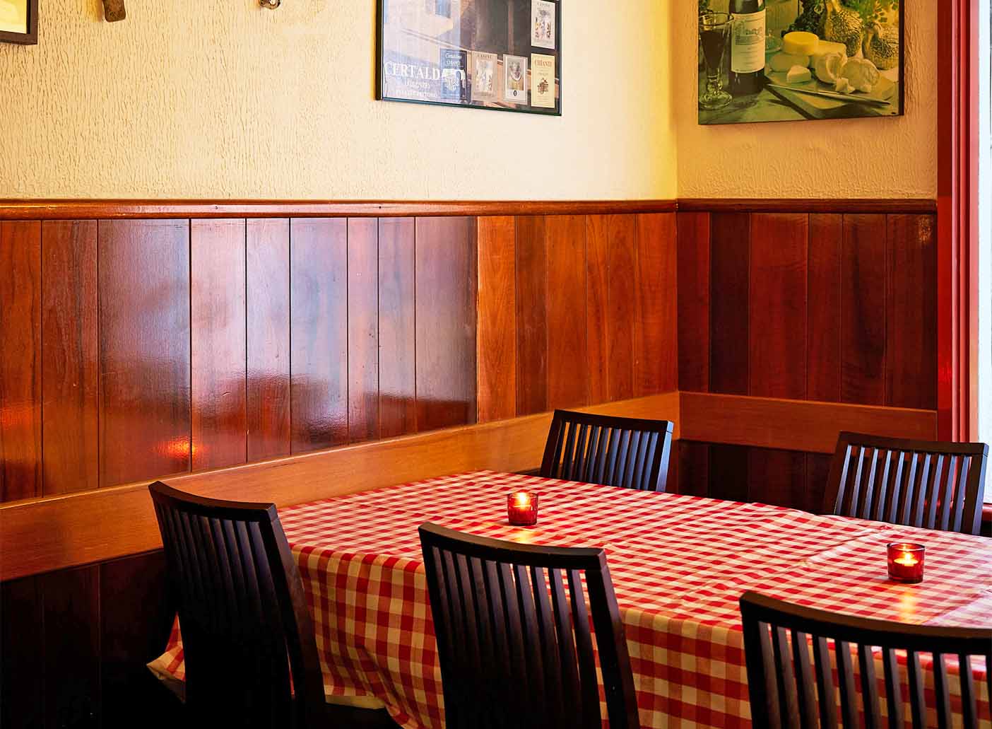 The dining room, tucked behind the iconic Railway fish tank, offers a quiet, semi-private space with checkered tablecloths and nostalgic artwork.