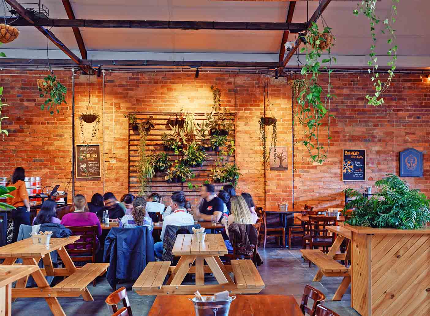 A fully customisable dining area allows for tailored spaces that suit any function, event or celebration. A striking stainless steel brewhouse is viewable from all sections of the venue, and is encompassed by a backdrop of exposed brick, cast iron arches, and greenery.