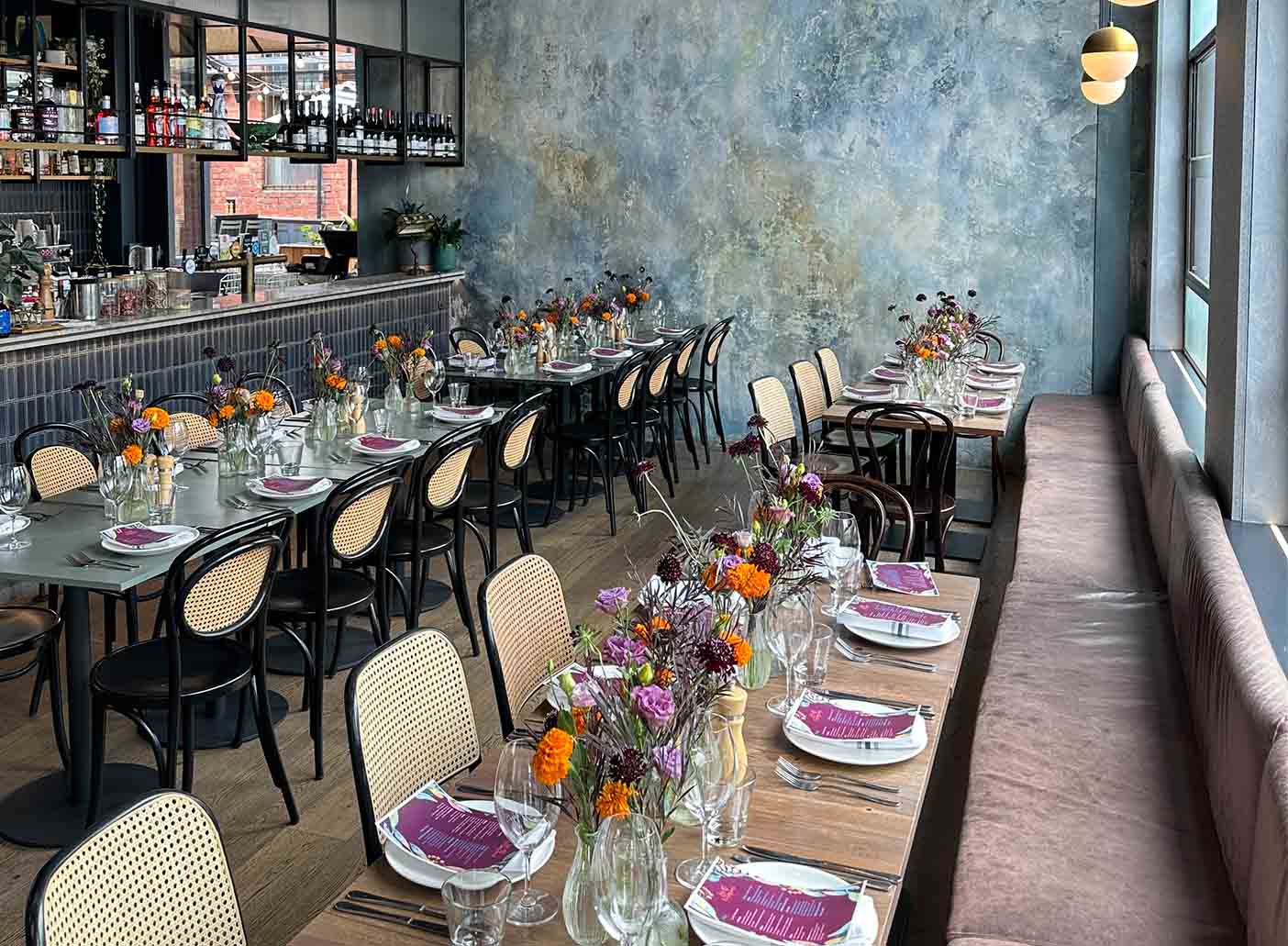 Welcome to The Front Bar, where natural light abounds and every corner is a delight for the senses. The feature wall, designed by the talented Clare Scanlan, is a beautiful imperfection that perfectly captures the many stories that this building has witnessed over the years. It's so worthy of an Instagram post!