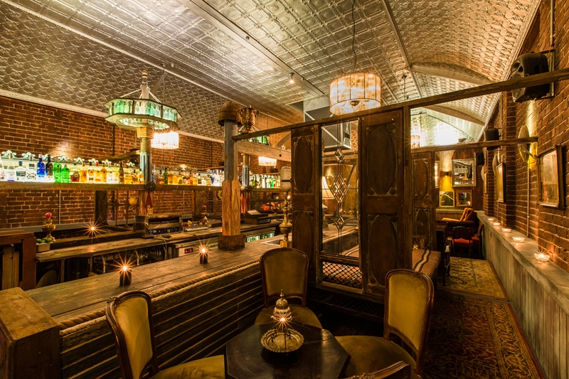 The warm brown and auburn tones extenuate the exposed brick walls, wooden furniture, velvet lined chairs and brown leather sofas. All of this work together to create a dark and moody atmospheric essence which will make sipping on a funky cocktail even more delicious.