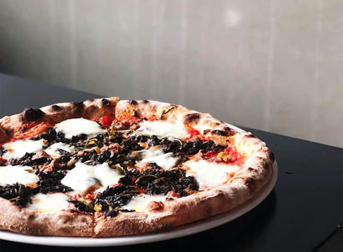 Tipico is your go to sophisticated pizza and cocktail bar, this modern industrial space has leather booths, hanging lights and a wood paneled enclosed kitchen.