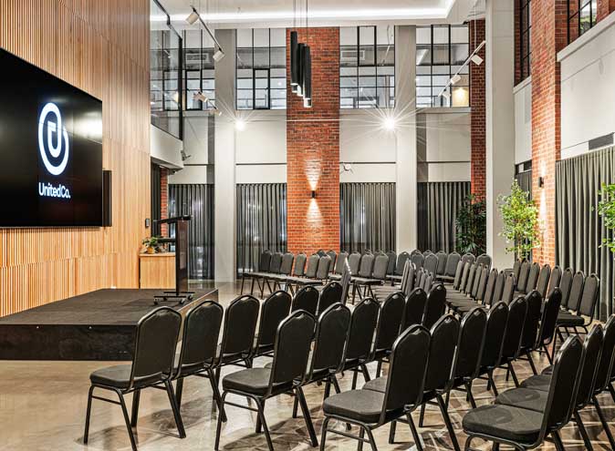 United Co's premium space is fitted out with just about everything you could need for your corporate event. The modern, blank canvas, converted warehouse space can be set up in multiple ways to suit your needs and can cater for groups of any size, up to 150 guests.