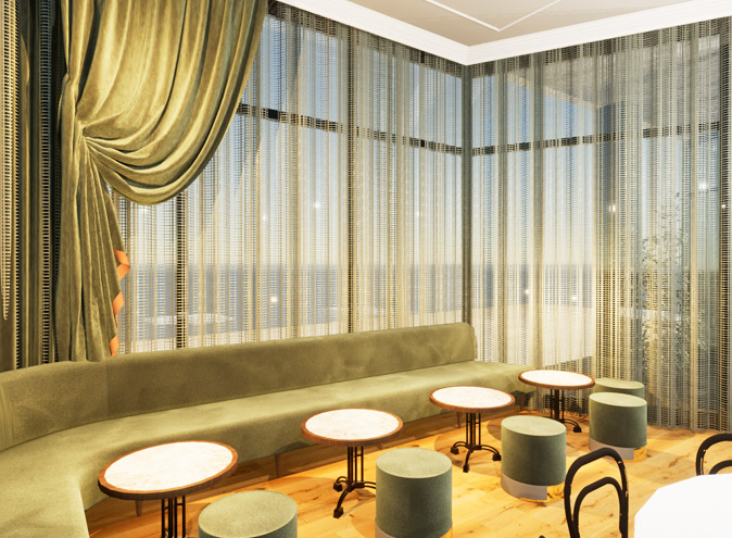 The designers at Studio Y have incorporated the thoughtfully considered ambient lighting, the delicate materiality of luminous brass accents, wainscoting with shades of green and an art deco-inspired mirror bar. For any special occasion, guests can add their own touches to make the event uniquely theirs.