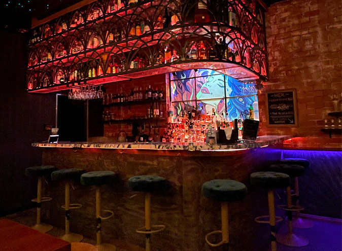 From the distressed brick walls, to an art deco inspired bar and bright back-lit artwork, Her Bar is a space full of excitement and grandeur, but still invites feelings of comfort and always has chill vibes. Spread over just one floor that used to be an old garage, Her Bar has been converted into a space where you can sit back and relax in the most comfortable couches known to man, or in a stool at the bar to wind down after a long week.