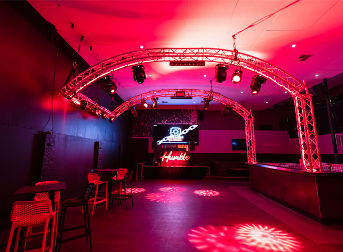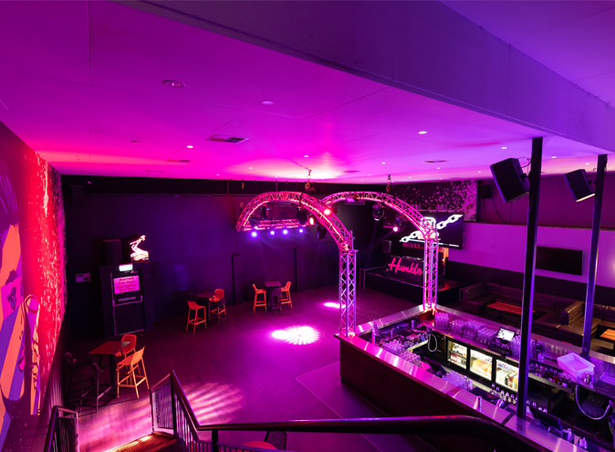 With high ceilings, a mezzanine level, a full lighting rig that acts as an extension from the bar, a stage, a DJ console, and a quality sound system, this room has it all and to top it off - two booths that can be privately booked out as a VIP area.