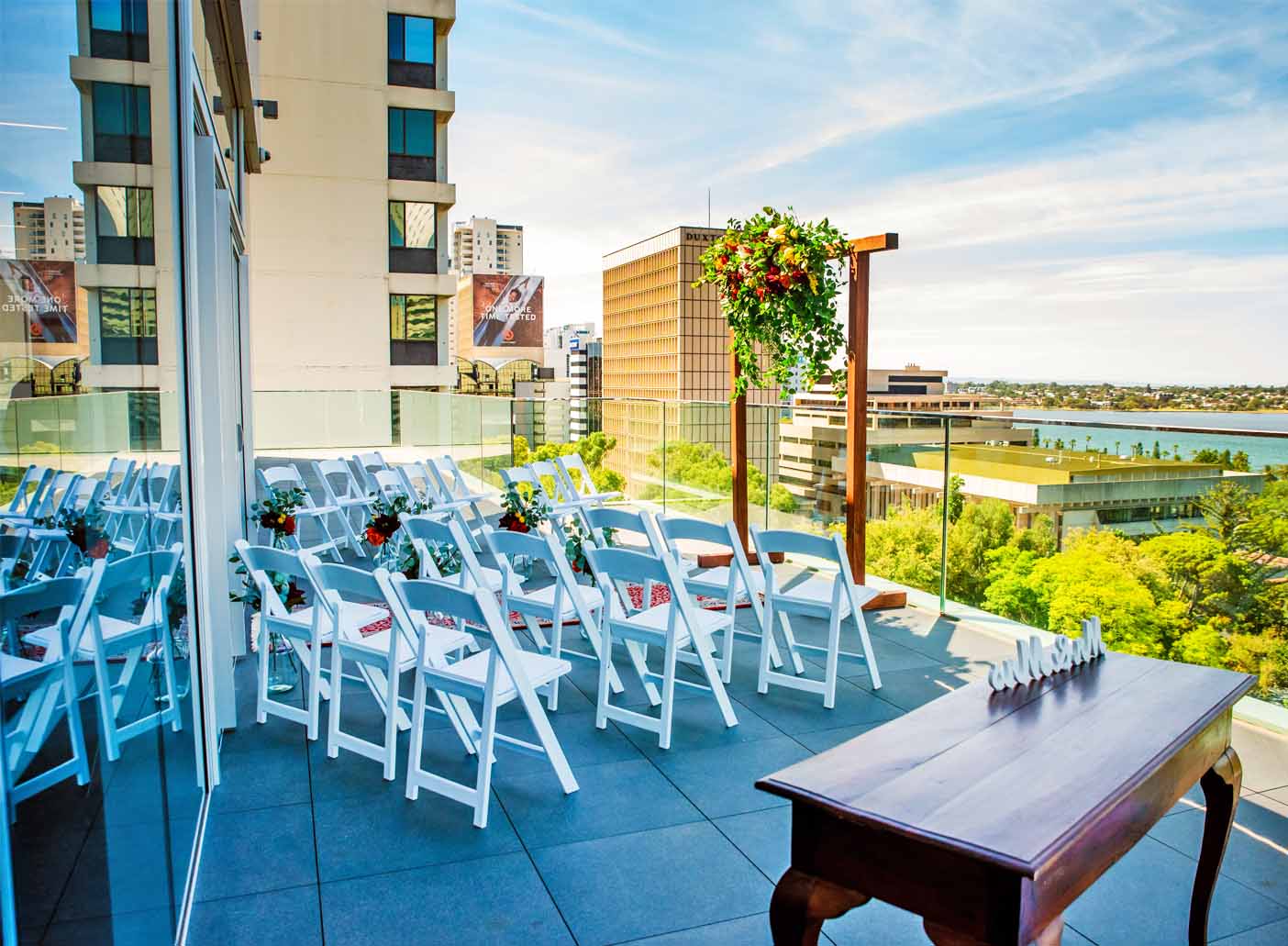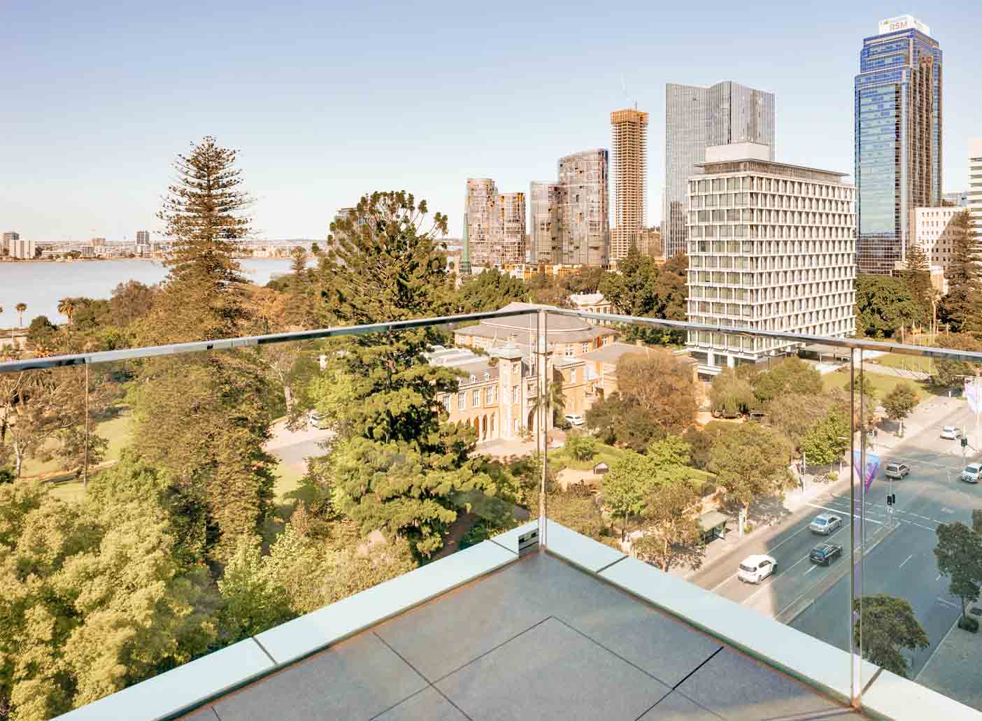 The balcony, which offers unobstructed 180-degree views of Government House Gardens and St Georges Terrace, will be fully accessible to guests. It’s a pillar-free space with a great view, plenty of natural light from the floor to ceiling windows, and neutral decor all around.