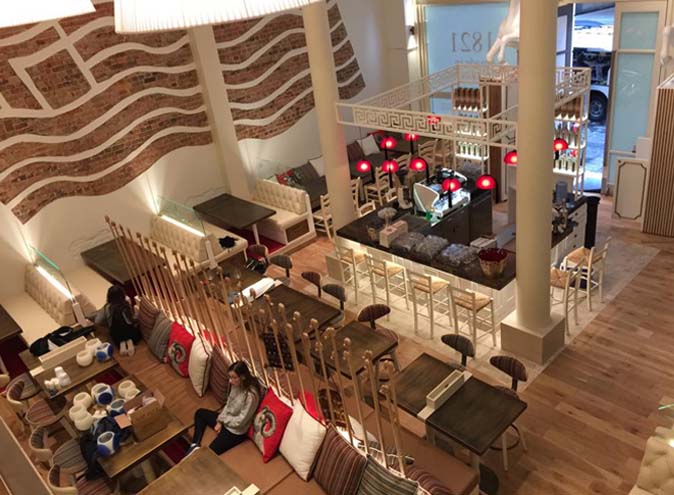 Paying homage to the 1821 Greek revolution against the Ottomans, this three-level restaurant is bold, unique and the perfect setting for your next weekend date. The large windows, high ceilings and towering columns evoke an Athentian feel, while the island bar with its vibrant red glow and black tassels adds a striking contemporary touch.