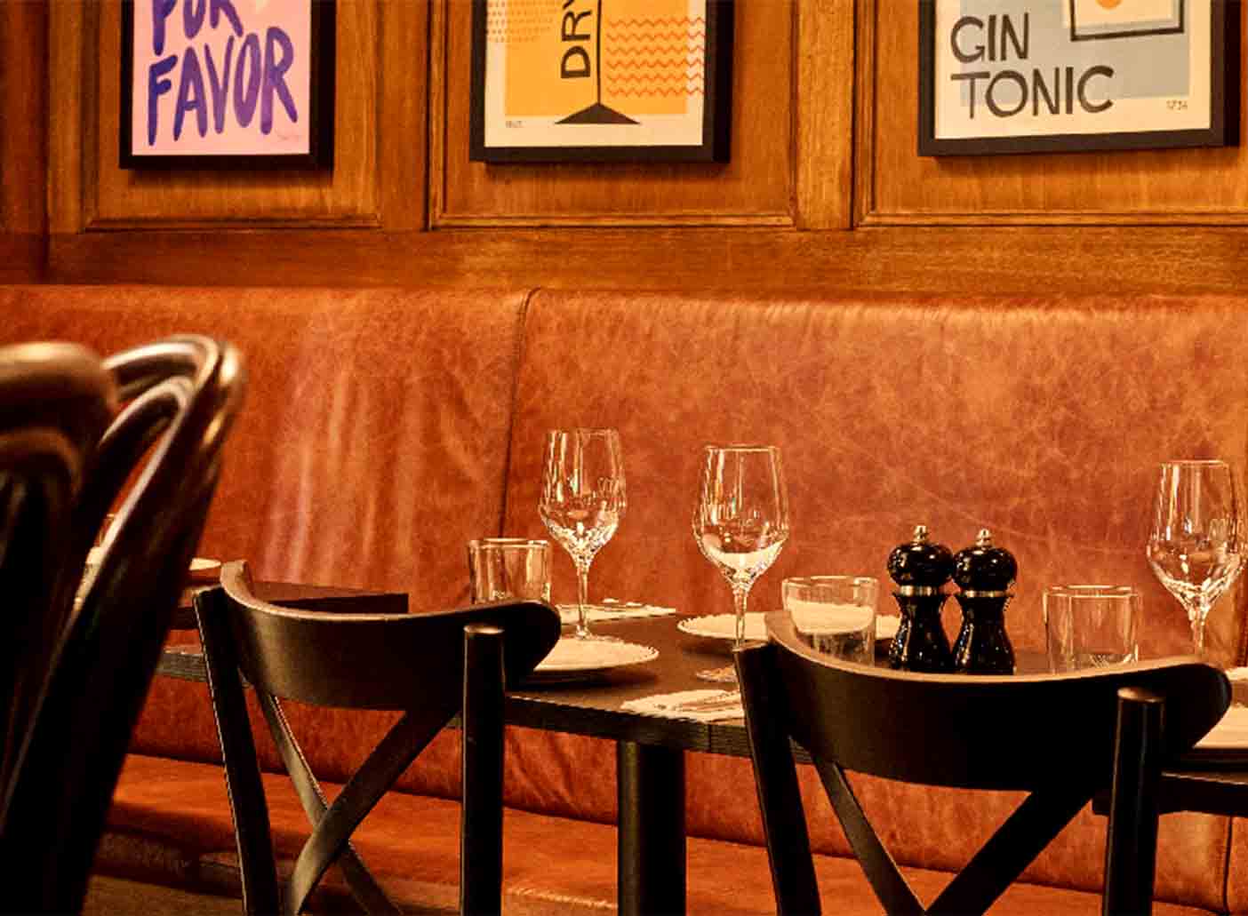 The bar counter itself features fluted timber panels and high-backed stools, inviting guests to settle in and enjoy crafted cocktails or a perfectly poured Spritz. Subtle design nods—like glass racks above, a neon Divino sign, and pops of retro pop‑art framing—add personality and evoke the cozy vibrancy of a Southern Italian locale turned up a notch.