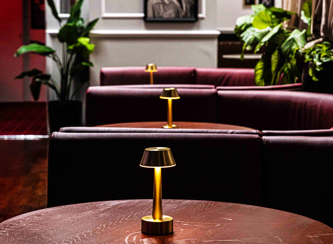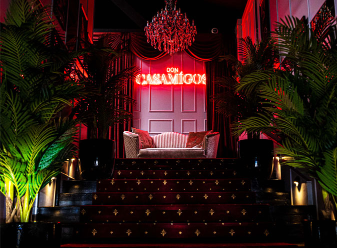 Up a large red staircase with this neon sign and velvet couch brings you to a spacious and lux venue called Don Casamigos.