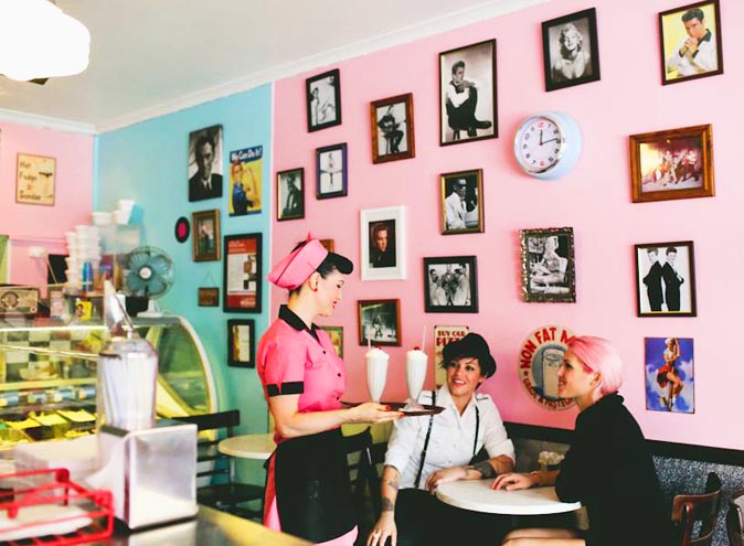 The interior is full of pink and bright colours with photos of old rock n roll stars covering the walls. There’s the typical shiny booths against one wall and a service bar along the other. The waitresses are dressed up as ‘Diner Dolls’ and the entire experience is like being in an old school American teen movie!