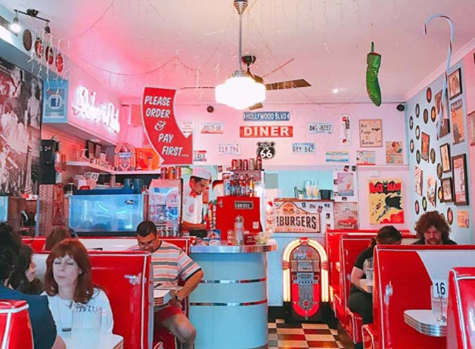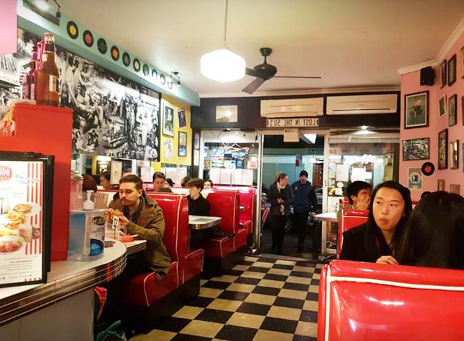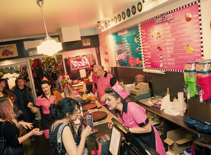 They are known for their crepe cones which can be made sweet or savoury. They also have all the American classics - burgers, hotdogs, shakes and waffles. Feast on all the American goodness whilst jamming to some 50's rock n roll!