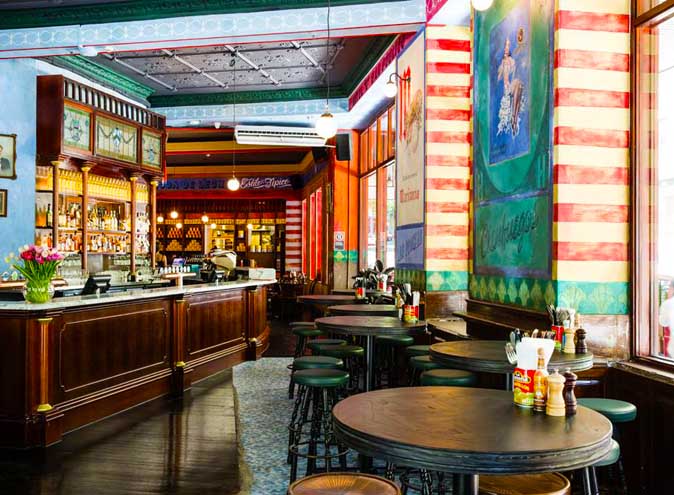 The décor is extremely retro-Cuban, with vintage style posters, some featuring revolutionary Che Guevara, on the walls and a bright colour scheme. The upstairs lounge is green and lush and makes for the perfect place for a quiet drink with a new date.