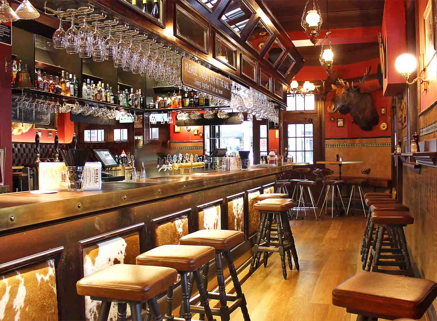 A classic, traditional style pub setting with dark wooden surfaces, a taxidermy moose head and a pretty hefty selection of craft beers!