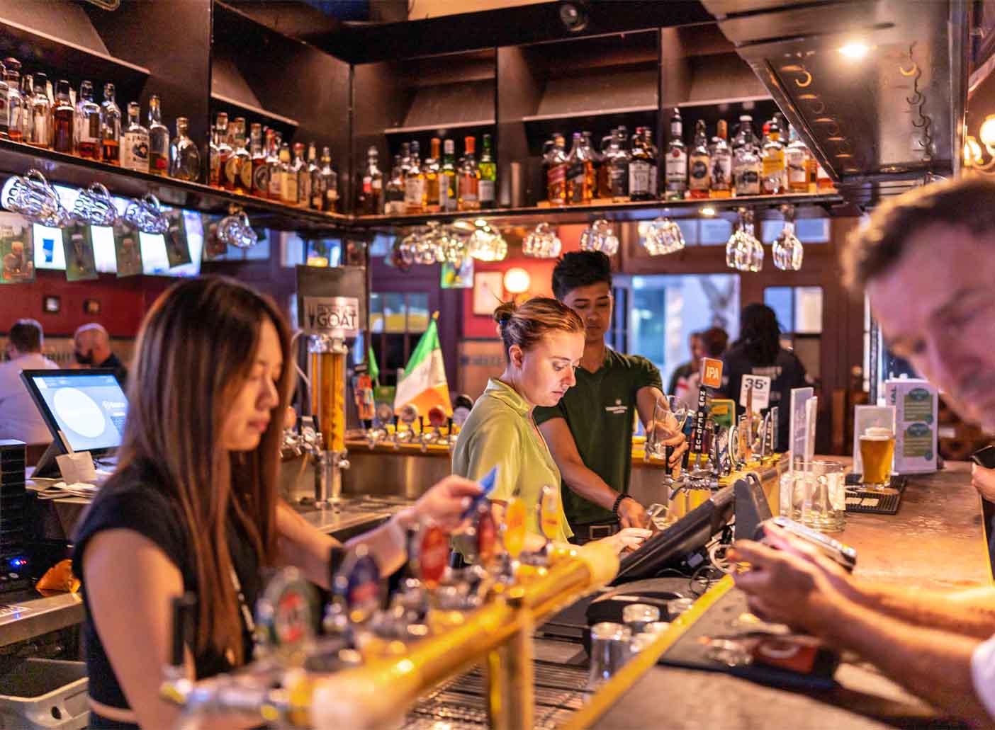 A traditional pub setting with classic decor ranging from wooden surfaces, a taxidermy moose head and a generous selection of craft beers!
