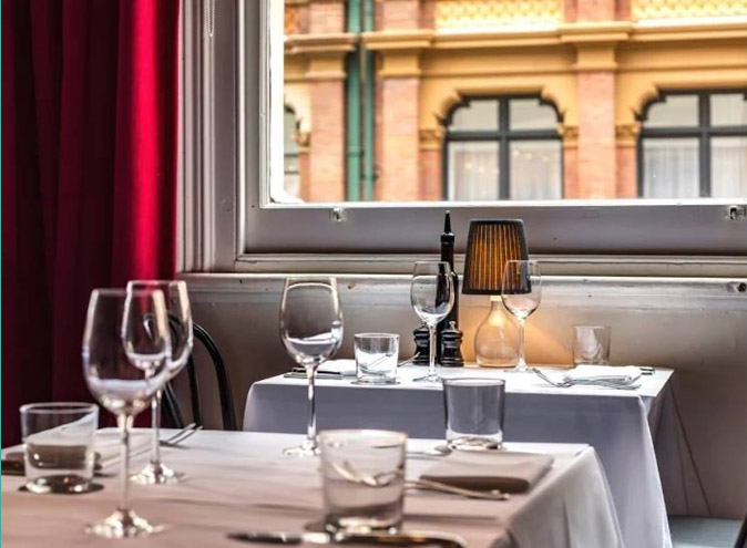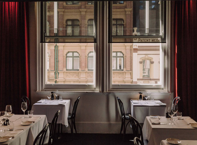 The elegant décor is reminds you of Italy with red curtains, white linens and dark carpet and they even have their own modern take on a Roman column with joinery piece at the entrance.