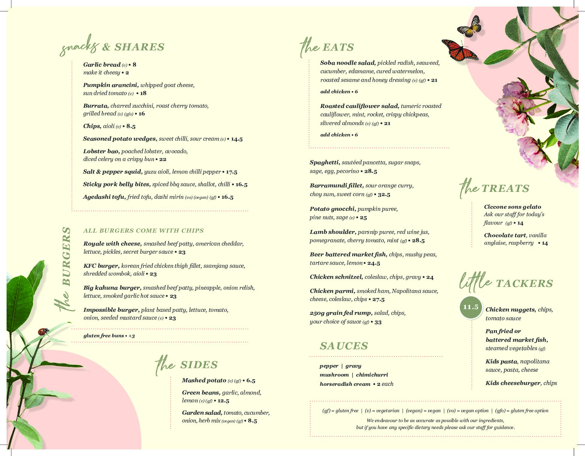 The menu changes seasonally to ensure variety, seasonality and sustainability with fresh ingredients used to prepare reimagined pub classics. Enjoy your quality pub meal in the various spaces throughout, including the sports bar on the ground floor as well as the restaurant on Level 1.