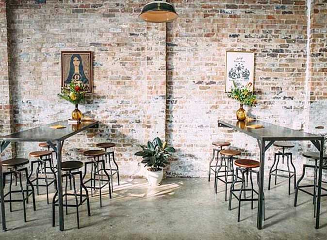 The bar is located in an industrial, high-ceiling warehouse with a minimalist interior and beautiful exposed brick.