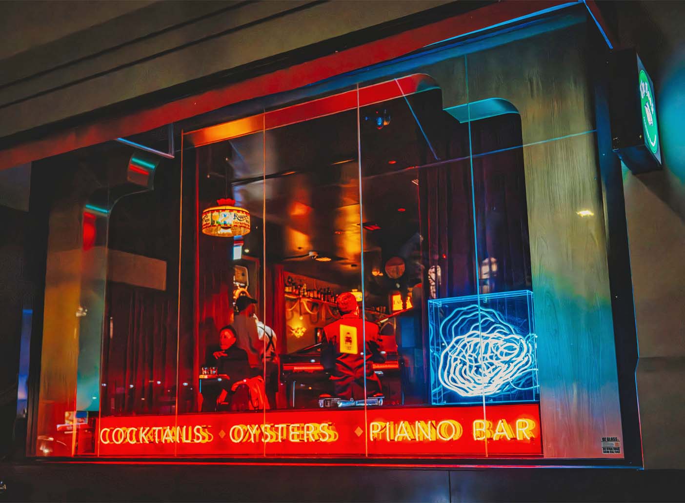 The Hook is a saloon-style bar with live piano, oysters, and a vibrant venue of saloon snacks from smashed burgers to hot dogs. The Hook brings together elements from trips to Ireland, Scotland and England – like the green-hued bar, whiskies and Guinness – as well as saloons and dive bars from New Orleans to New York.