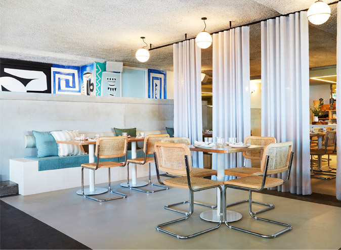 Leading Topikós' interior design, Anna Hewett has given the space a contemporary, streamlined and airy feel. Concrete, rough render, fossilised stone, earthenware pottery and mid-century light fixtures are all present in the room and serve as important design elements.