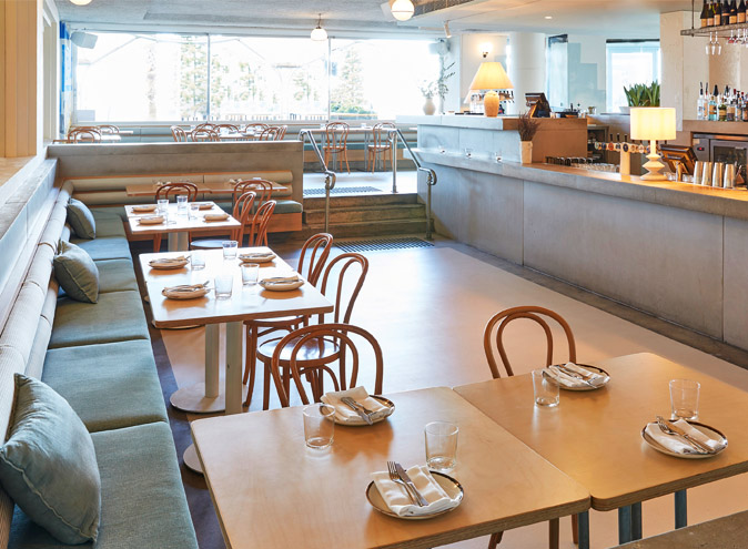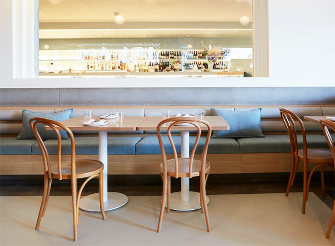 This open and gorgeous space also features Greek key icon inspired stepped windows and a marble mosaic chef’s bench fitted opposite the roughly rendered banquet seating that runs the length of the 80-seat dining room.