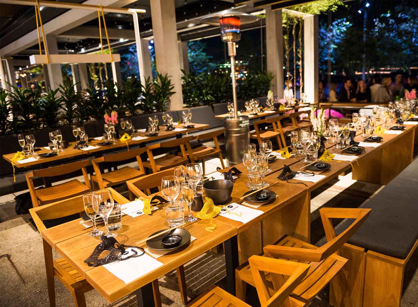 The expansive semi-outdoor dining space not only showcases the stunning surroundings